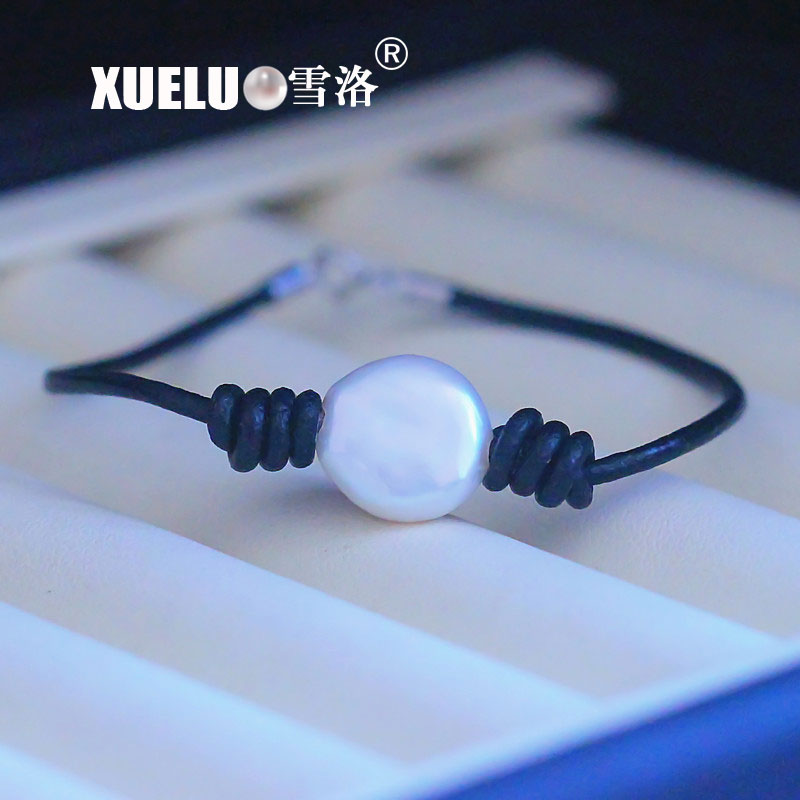 Real Leather Natural Cultured Freshwater Coin Pearl Bracelet for Wholesale (XL150120)